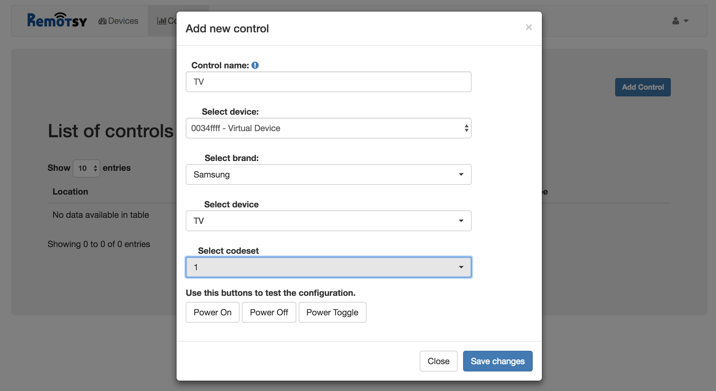 The next step is to find the infrared code for your appliance so that you can control it. Start the search using the brand, then the type. In some cases, we have more that one possible code for your appliance, these are the code-set. Using the button "Power On," "Power Off" or "Power Toggle," you can test if the code-set is the right one for your appliance.